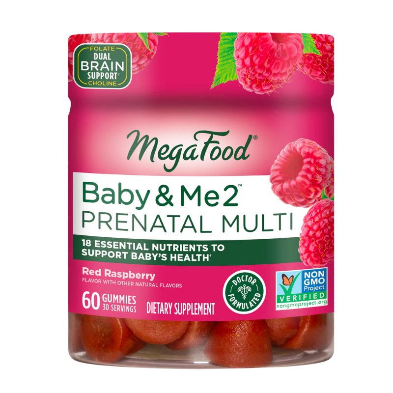 Baby & Me 2 Prenatal Multi Gummies from MegaFood is doctor-formulated to offer nutritional support for the pregnant mother and developing baby. It contains 17 essential nutrients including folic acid and choline to support the baby's healthy brain development. Vitamin B12 and vitamin B6 are included for cellular energy production.