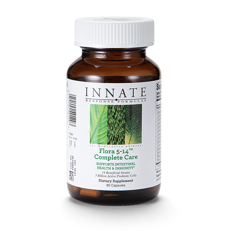 Flora 5-14 from Innate Response is a probiotic formula for adults and children with 14 unique probiotic acid resistant strains and 5 billion active probiotic bacteria per capsule.