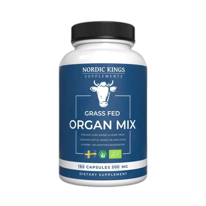 100 % Grass fed Organ Mix from Swedish organic certified animals contains organic liver, heart and kidney from beef and nothing else. The animals are raised on 100% grass and herbs and 0 % grains. 100 % Grass Fed & Organic Organic Mix is gently freeze dried to maintain the best possible nutritional profile.