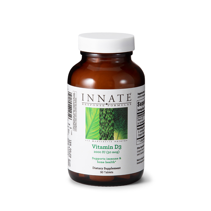 Vitamin D3 2000 IU (50 µg) from Innate Response is a whole food supplement providing 2000 IU of vitamin D3 per tablet. Vitamin D is an essential vitamin and maintaining optimal levels daily can contribute to an overall sense of well-being. Vitamin D in the form of cholecalciferol is the more easily absorbed and utilized form of vitamin D.